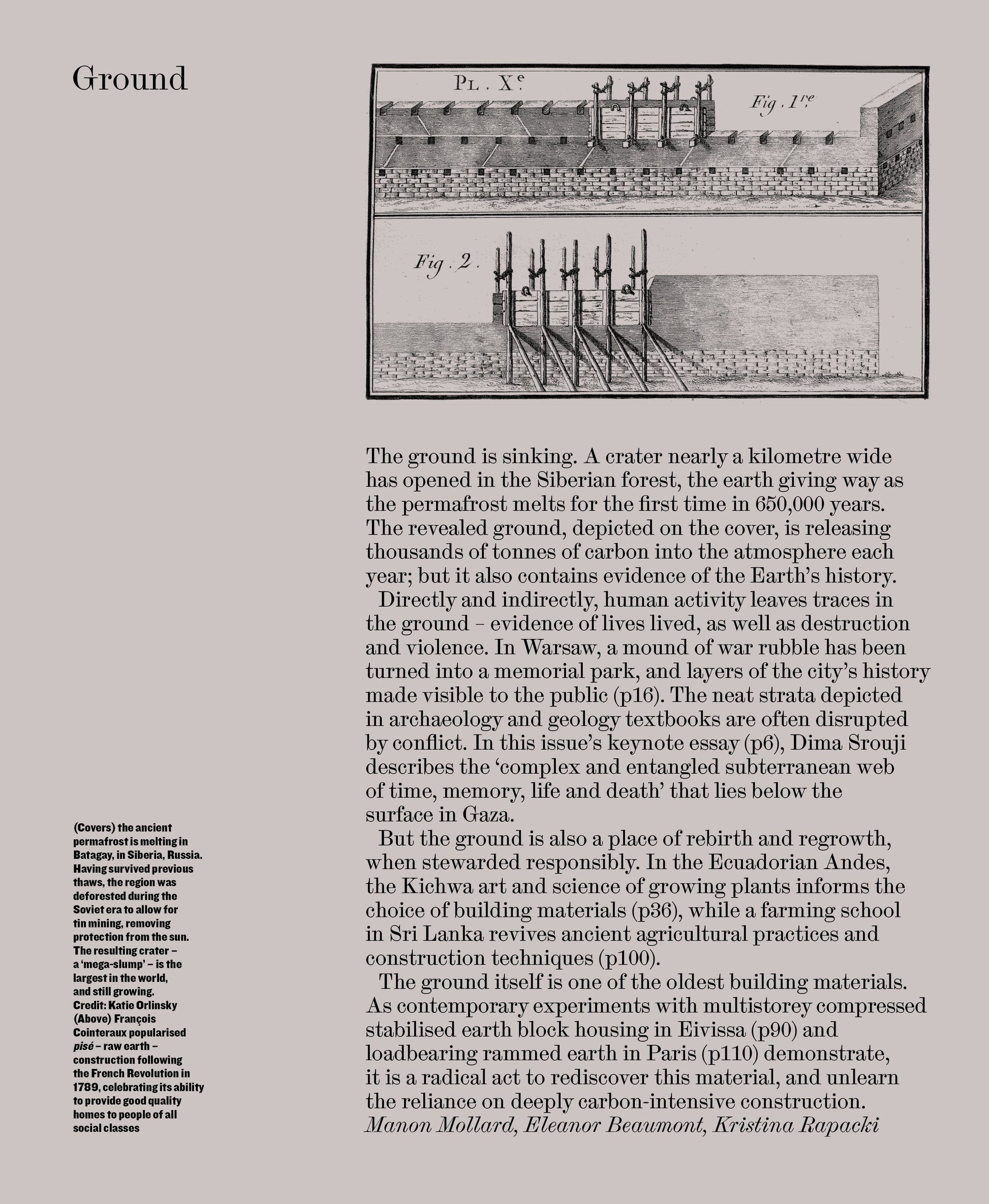 The ground is sinking. A crater nearly a kilometre wide has opened in the Siberian forest, the earth giving way as the permafrost melts for the first time in 650,000 years. The revealed ground, depicted on the cover, is releasing thousands of tonnes of carbon into the atmosphere each year; but it also contains evidence of the Earth’s history. In the issue’s keynote essay, Dima Srouji traces entangled histories in the ground of Gaza, a ‘subterranean web of time, memory, life and death’. But the ground is also a place of rebirth and regrowth, as buildings in the issue in Ecuador, Sri Lanka and elsewhere show. Some of these buildings rediscover the ground as a structural material, radically unlearning the reliance on carbon-intensive construction. Read the full editorial